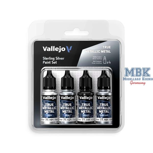 The Vallejo True Metallic Metal range is a well-designed 4-step system: Base, Light, Shade, and Airbrush. Each color is available in its respective version.