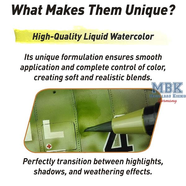 - Transparent watercolor pigments: The colors are transparent, allowing for subtle layering without covering the base coat—perfect for filters, shadows, dirt, rust, and smooth color transitions.