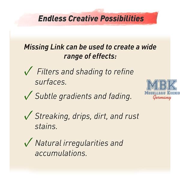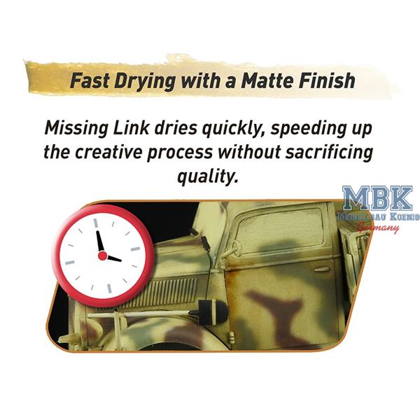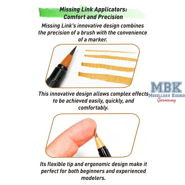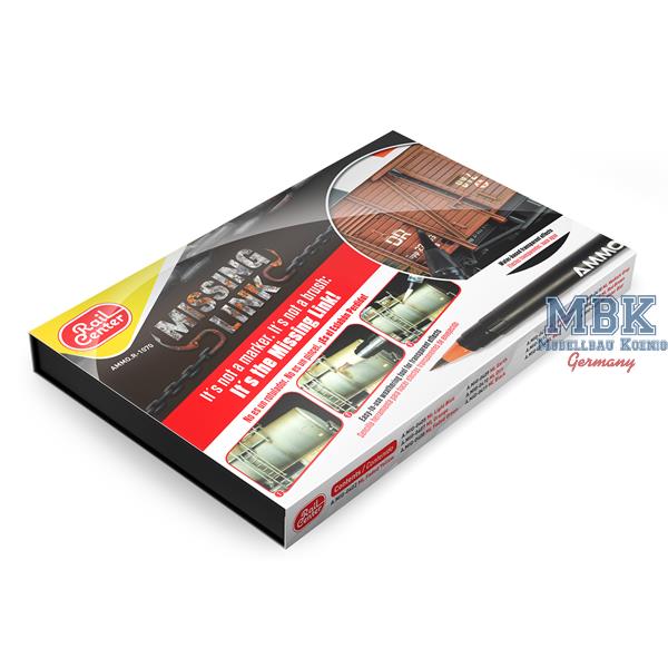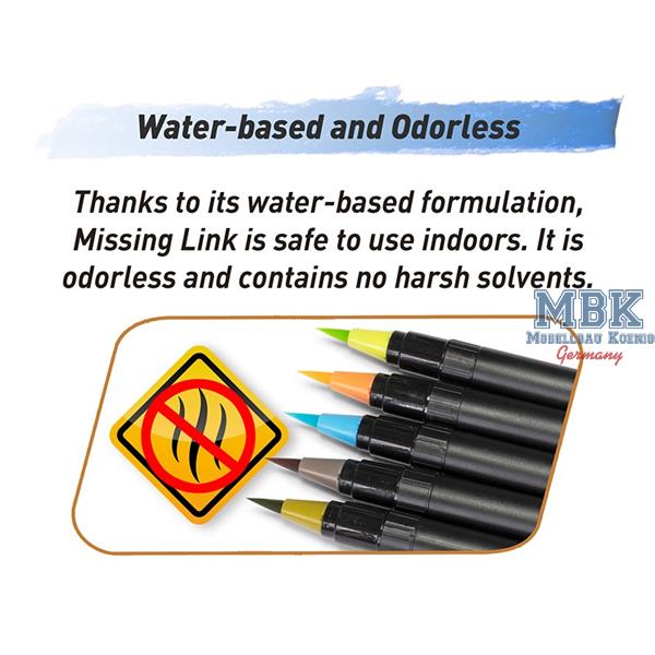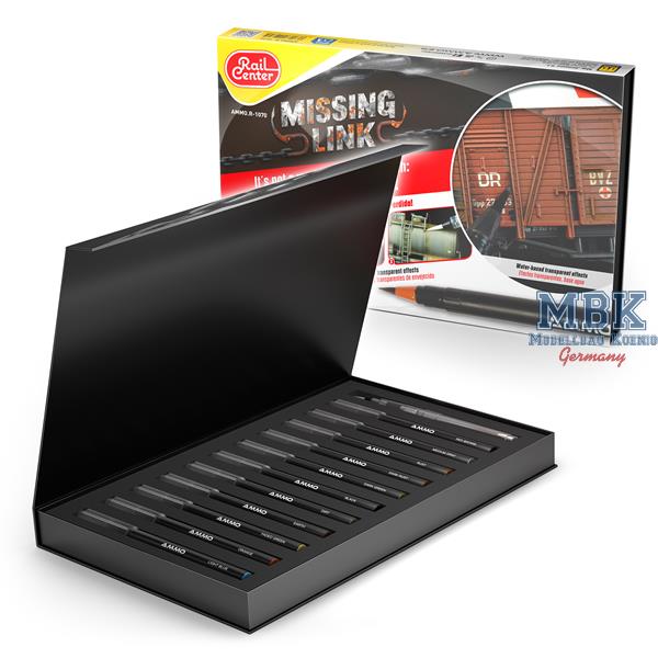 The new brush tip watercolor marker set from AMMO by MIG Jimenez represents an evolution in modeling tools. Designed for precision, versatility, and ease of use. This set of 12 transparent colors has been carefully selected to reproduce realistic weathering and wear effects on locomotives and rolling stock from all eras, with professional results. With Missing Link Brush Tip markers, you can apply everything from filters to weathering effects on your models. Each marker features a high-precision flexible brush tip that delivers smooth, controlled strokes—from fine lines to medium and broader coverage—making it perfect for both detailed work and large surface effects without the need to switch tools.